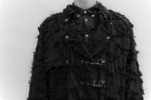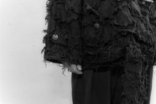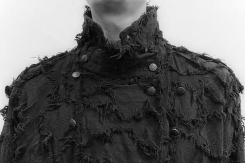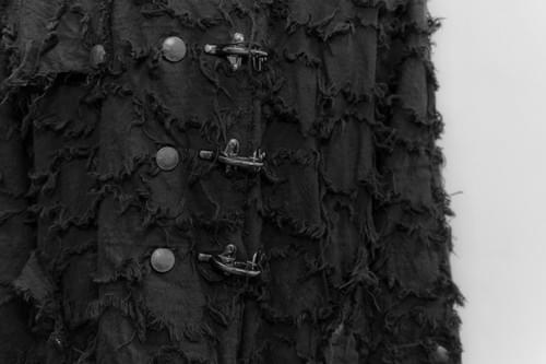 鈕扣選用脫漆的做舊鈕扣,增加衣服的傷量感,布料選用手工剪花布,毛邊很像氂牛行走時的姿態。